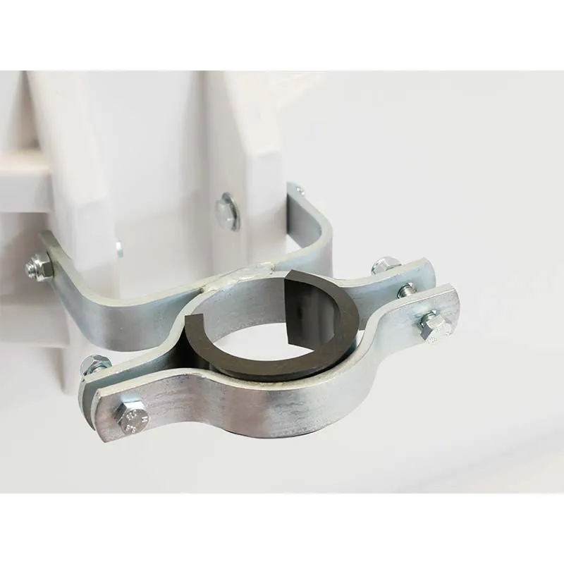 Der offene runde Kunststoffring dient dabei als Reduzierstück von Ø 76 mm auf Ø 60 mm. Durch den Klemmring lassen sich die Verkehrs- und Beobachtungsspiegel mit deren 76er Halterung an dünneren Pfosten mit Ø 60 mm sicher befestigen.