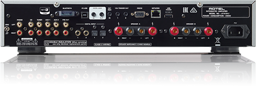 Doppelte Lautsprecherausgänge mit Universalklemmen erlauben Installationen mit 2 Zonen. Die Lautsprecherausgänge A und B werden über Relais geschaltet. Das Grafikdisplay auf der Frontplatte hat eine große Lautstärkeanzeige und liefert Informationen zum Audiostream.