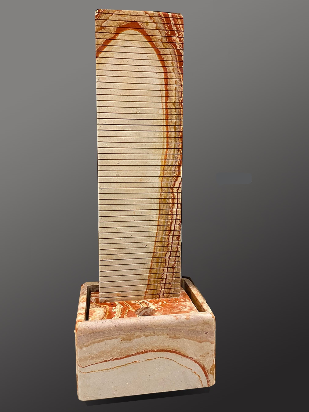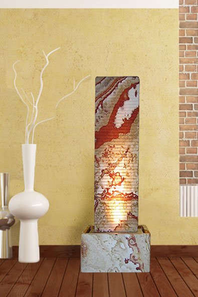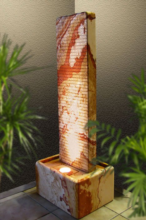 Dieser Brunnen aus dem beispiellosen Regenbogen-Sandstein begeistert durch seine angenehmen warmen Farbtöne. Durch seine Größe ist er ein effektiver Luftbefeuchter für jeden Wohn- oder Büroraum. Die Rillen an der Vorderseite bringen das herabfließende Wasser in Bewegung und verstärken den optischen Effekt. Auf der Rückseite ist die Oberfläche glatt.