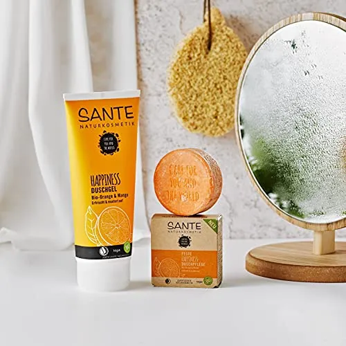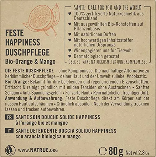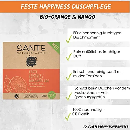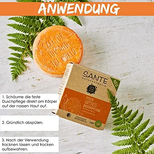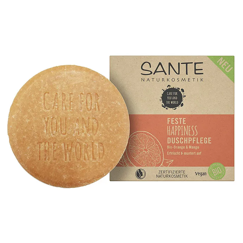 - Die SANTE HAPPINESS Feste Duschpflege ist die nachhaltige Alternative zu herkömmlichen Pflegeprodukten. Verpackt in einem Karton aus wiederverwerteten Fasern – #noplastic – hat sie einen fruchtigen Duft und ist sanft schäumend, sodass Sie keine Kompromisse eingehen. Die Haut wird mit milden Tensiden ohne Austrocknen gründlich gereinigt und angenehm erfrischt. Die enthaltene Bio-Orange hat außerdem belebende und regenerierende Eigenschaften. Es entsteht ein zartes Hautgefühl in Kombination mit einem unnachahmlichen Anti-Spannungsgefühl.