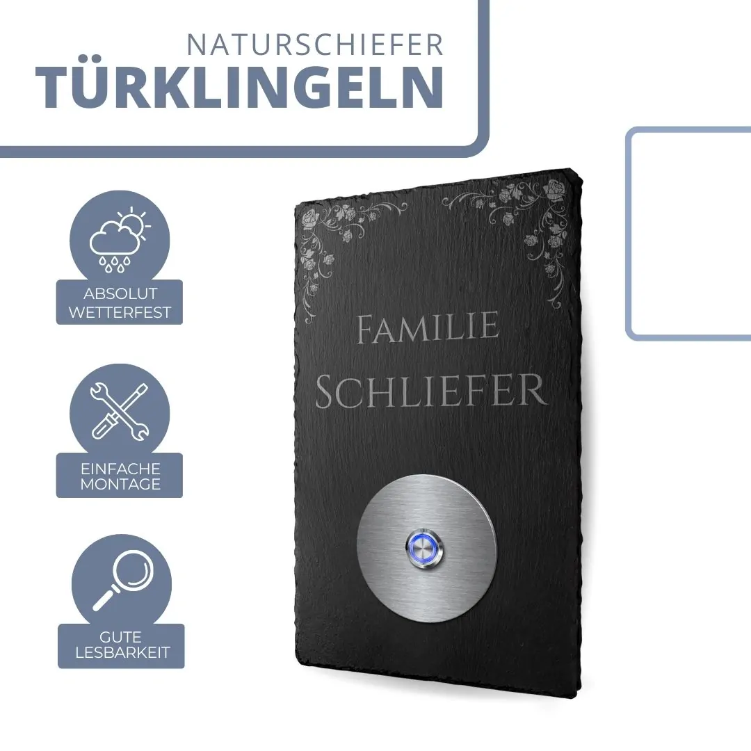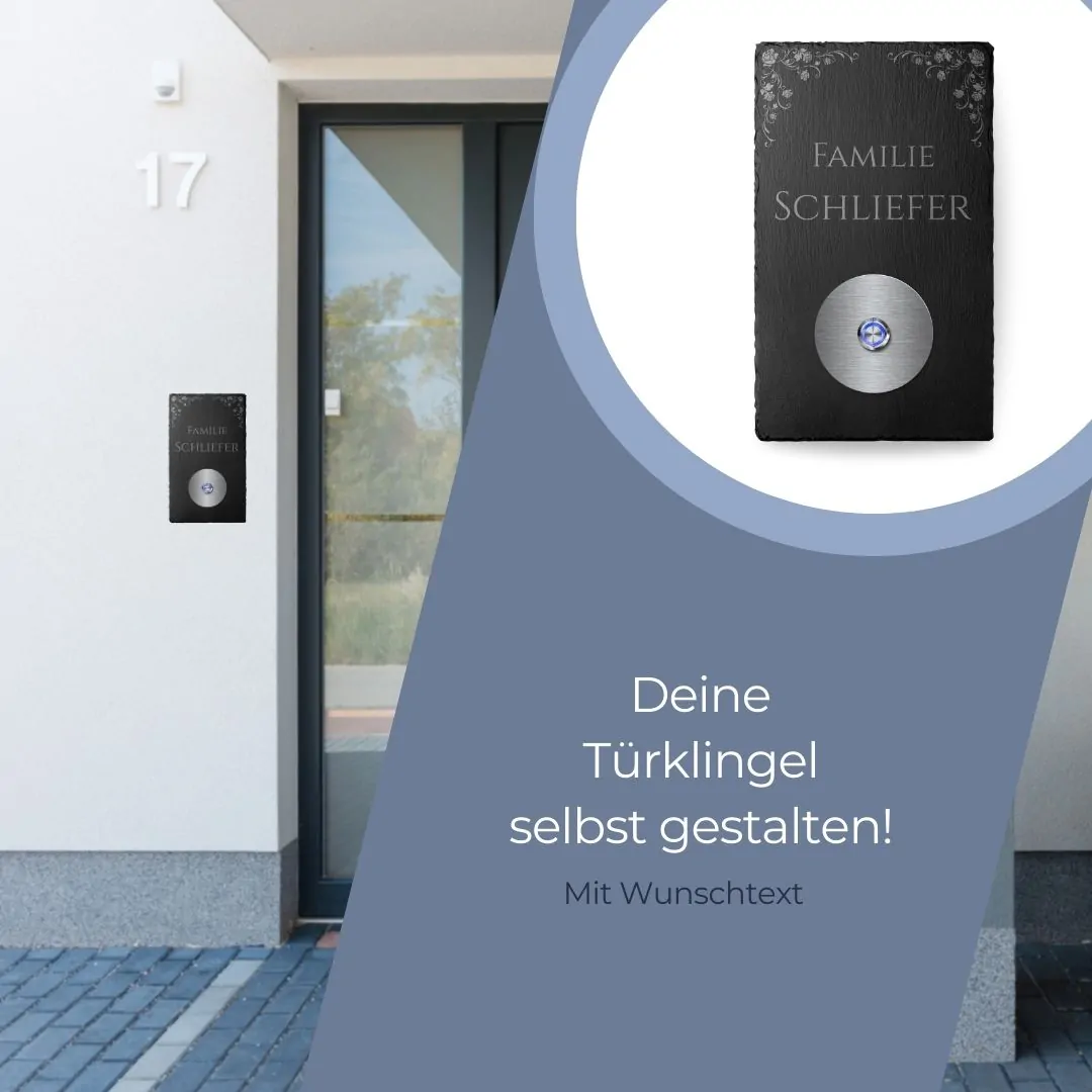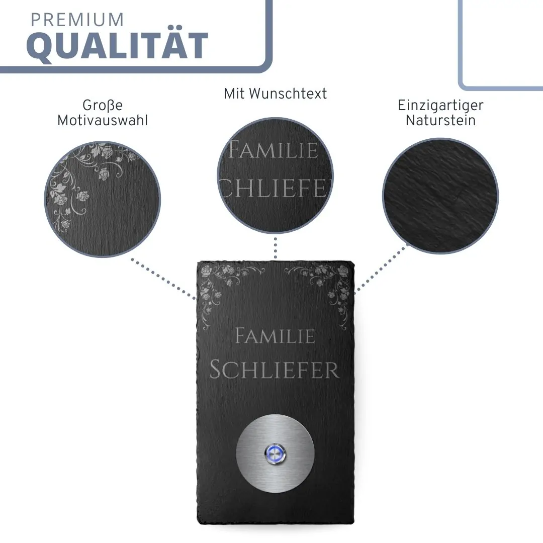 Wir nutzen für die Produktion unserer Türklingeln ausnahmslos hochwertige Materialien. Zudem werden Die Schieferplatten mit unseren hochwertigen Industrielasern präzise in Handarbeit graviert. Das besondere Lasergravurverfahren sorgt dafür, dass die obere Schicht abgetragen wird und ein hübscher Kontrast zum dunklen Narturschiefer entsteht. Außerdem weisen unsere Klingelschild dank der wertvollen Maschinen alle einen detailreichen und sauberen Schnitt auf. Wir möchten trotzdem darauf hinweisen, dass sich aufgrund der einzigartigen Struktur des Naturschiefers kleine Unebenheiten oder Wölbungen nicht ausnahmslos vermeiden lassen. Außerdem musst Du darauf achten, dass das Klingelschild vor Ölen und anderen Fetten geschützt wird, da sich die Gravur ansonsten möglicherweise verfärben könnte.