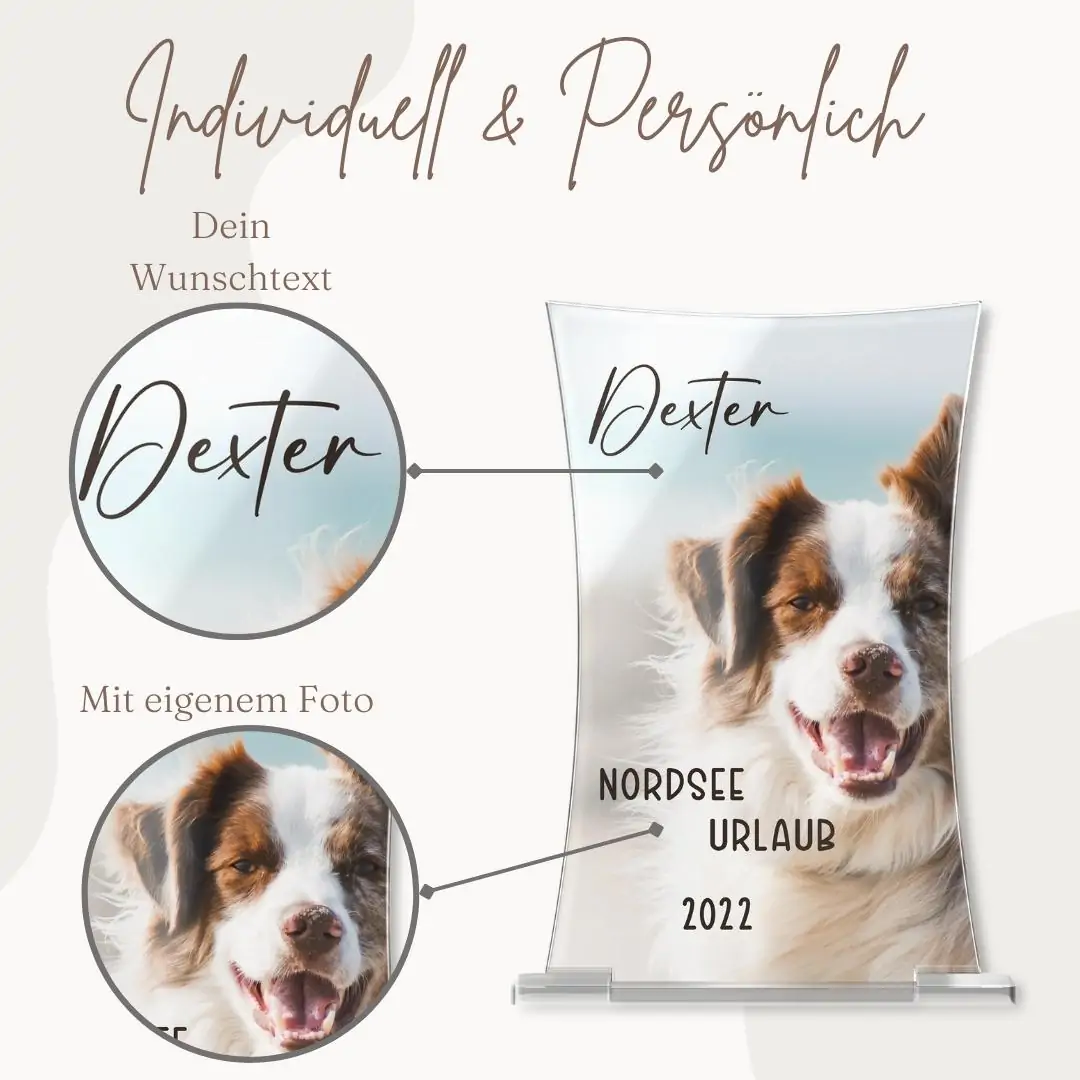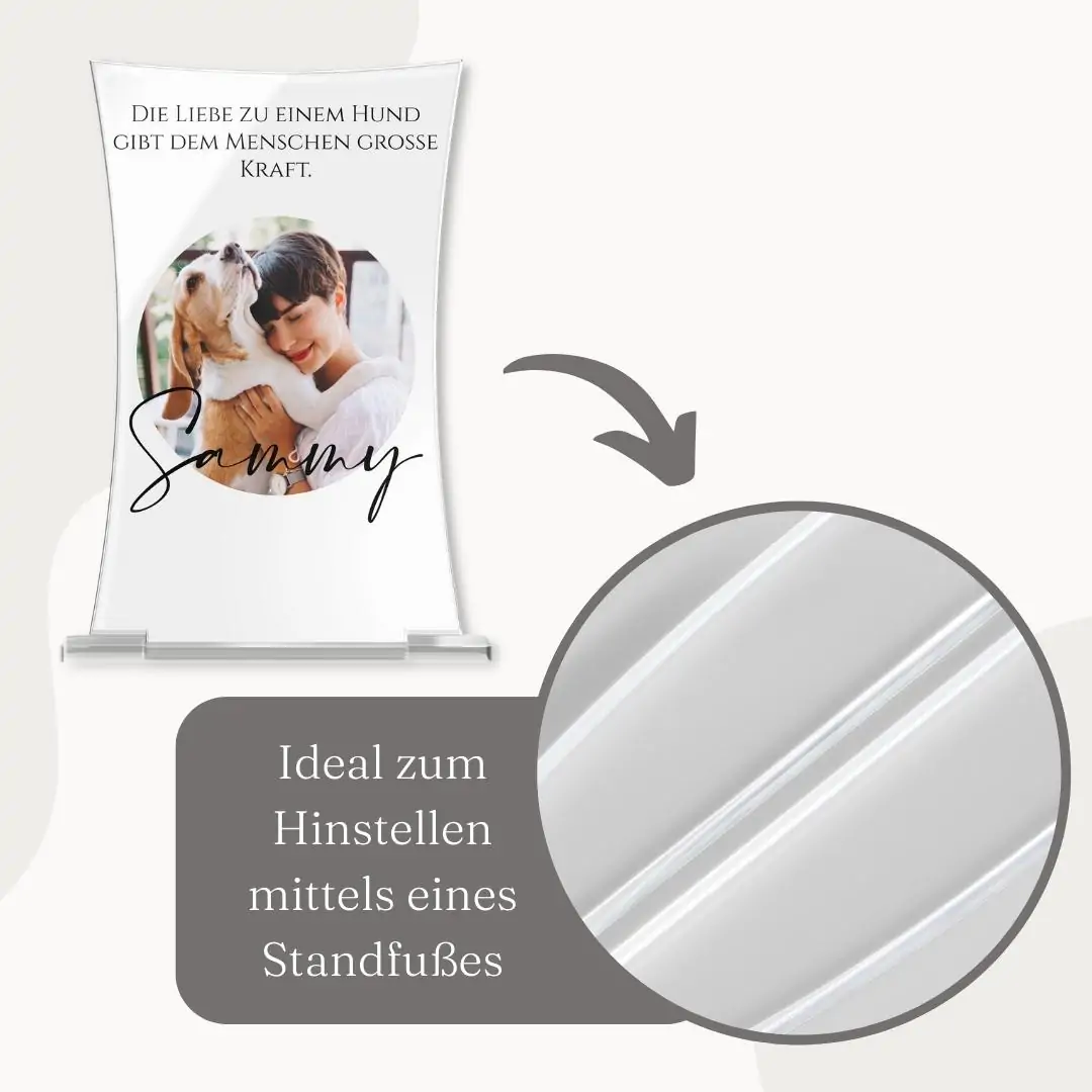 Verewige einen unvergesslichen Moment, einen besonderen Menschen oder einen geliebten Vierbeiner auf unseren schönen Standbildern aus hochwertigem Hochglanz Acrylglas. Bei uns kannst Du ein einzigartiges Erinnerungsstück für Dein Wohnzimmer, den Arbeitsplatz oder jeden anderen Ort Deiner Wahl ganz nach Deinen individuellen Vorstellungen erstellen. Fülle das Standbild mit Leben, indem Du ein Design auswählst und ein persönliches Foto einfügst. Anschließend kannst Du es nach Deinem Belieben mit einer persönlichen Widmung oder einem unserer unzähligen Motive verzieren. Deiner Kreativität sind keine Grenzen gesetzt. Das Bild liegt leicht geneigt auf der Seite, wodurch es bei Lichteinstrahlung eine hübsche Spiegelung aufweist. Auch im Dunkeln kannst Du dich von Deinem Standherz begeistern lassen, indem Du dahinter eine Kerze anzündest, welche das Standbild im gemütlichen Kerzenschein leuchten lässt.