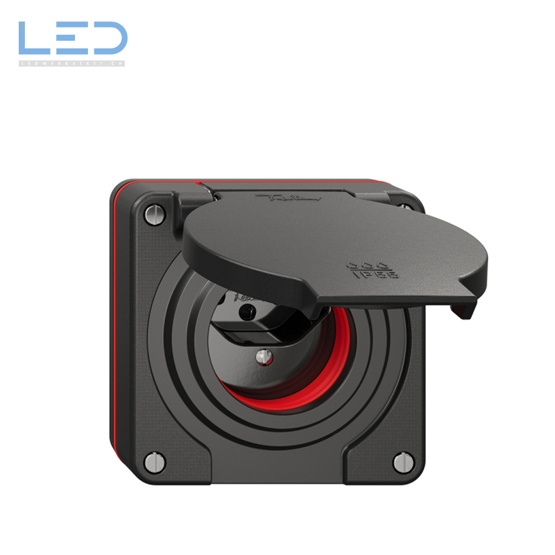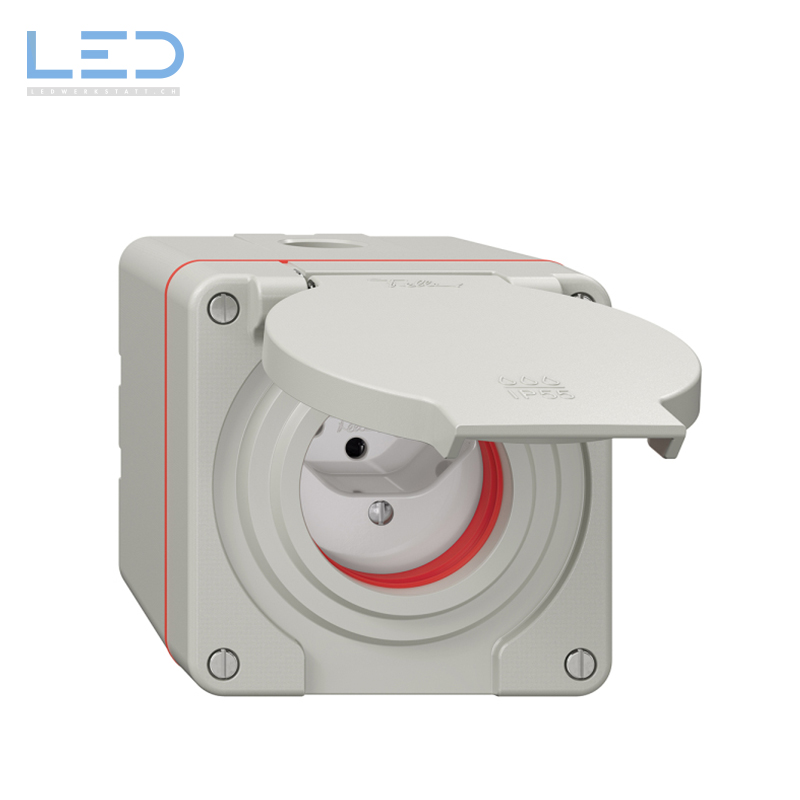 Die Gehäuse der IP55/IP55 Steckdosen müssen einen mechanischen Schutz nach SN EN 62262 von mindestens IK07 aufweisen. Der IK-Test erfolgt mit geschlossenem Deckel bei Raumtemperatur.