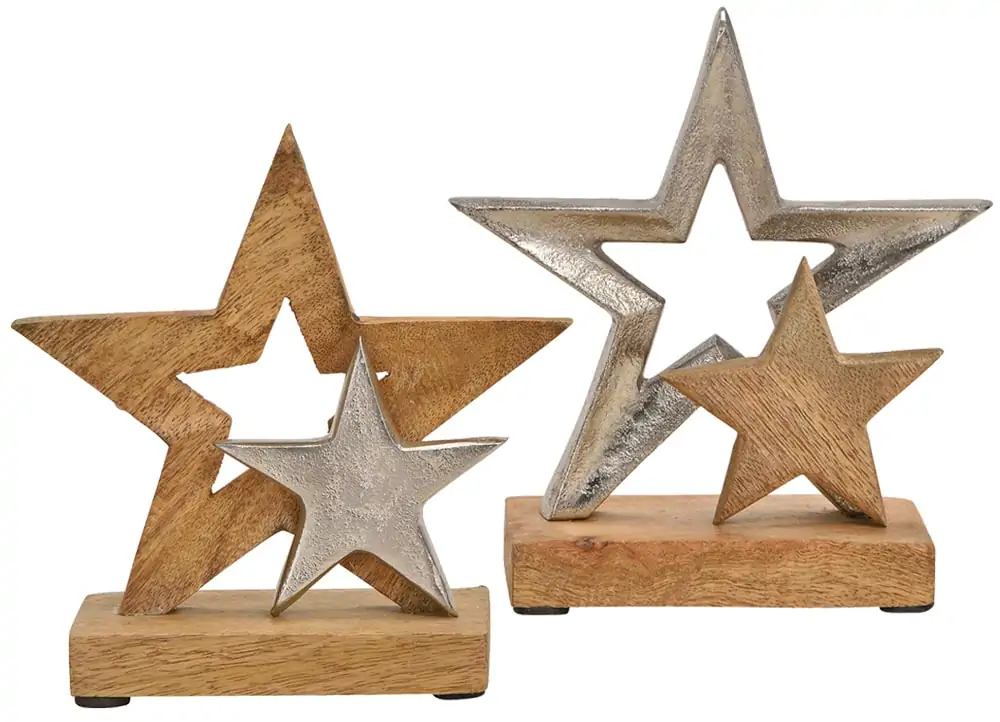 matches21 Kleine & große Sterne aus Metall & Sockel aus Mangoholz Dekofiguren Skulpturen Sterndeko 2er Set sort 15×6 cm