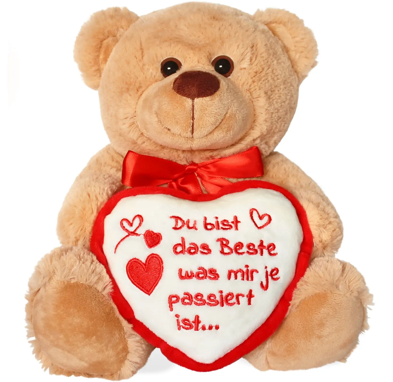 • 25 cm groß, hellbraun und mit aufgesticktem Spruch „Du bist das Beste was mir je passiert ist..“