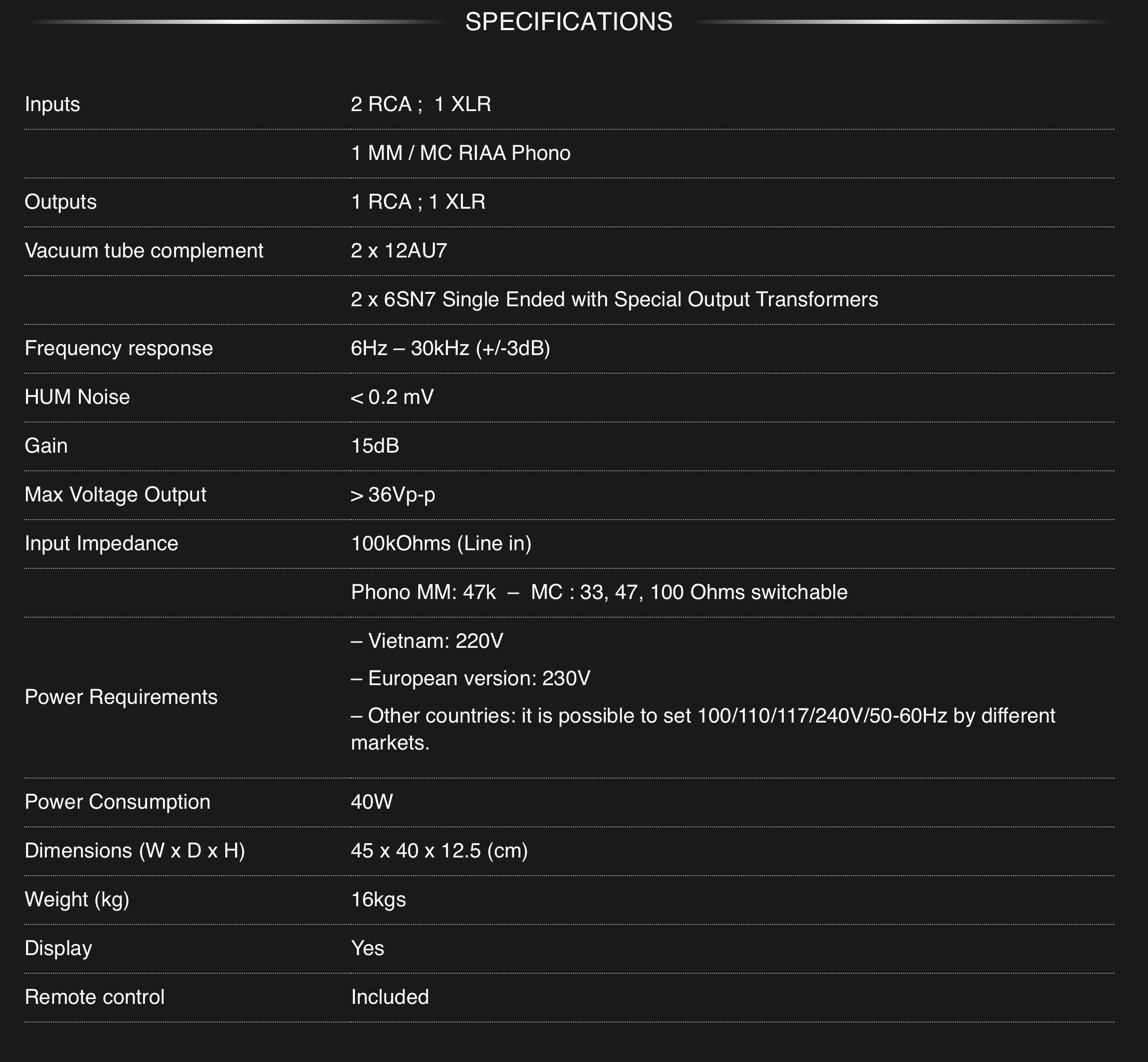 Dieses neueste Pre-Röhren-Produkt reproduziert einen kräftigeren und solideren Klang dank der Verwendung von separaten Quellen für verschiedene Verstärkungsstufen. Die Audiosignalverarbeitung ist somit vollständig und sehr effektiv. Der Rauschindex erreicht seinen niedrigsten Wert, was zu einem ruhigen und reinen Hintergrund und einer verbesserten Detailwiedergabe führt.