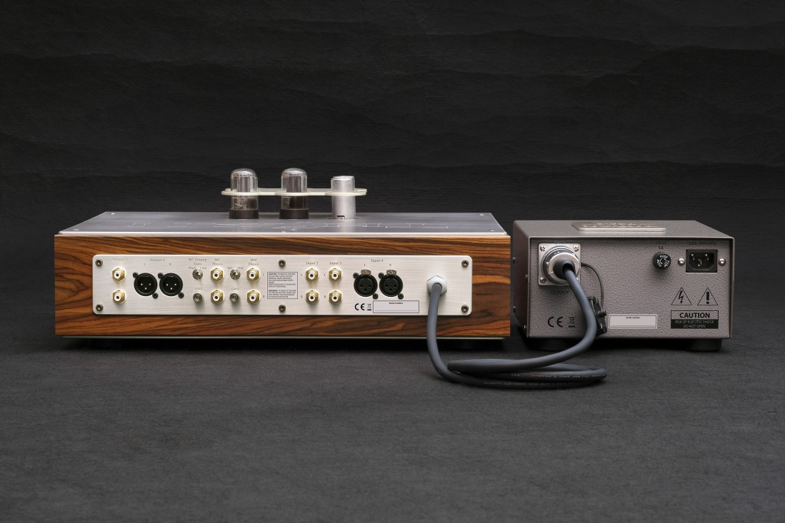 Es handelt sich um einen hochwertigen zweiteiligen Vorverstärker, der für ein optimales Klangerlebnis und eine flexible Nutzung entwickelt wurde – Hauptchassis und separates Netzteil – verbunden durch ein spezielles, am Hauptchassis befestigtes Kabel. Die Modularisierung der Phonoverstärker- und Line-Verstärker-Sektion ermöglicht sowohl die Vorteile der Handverdrahtung als auch kürzeste Signalwege, vergleichbar mit einer Leiterplatte.