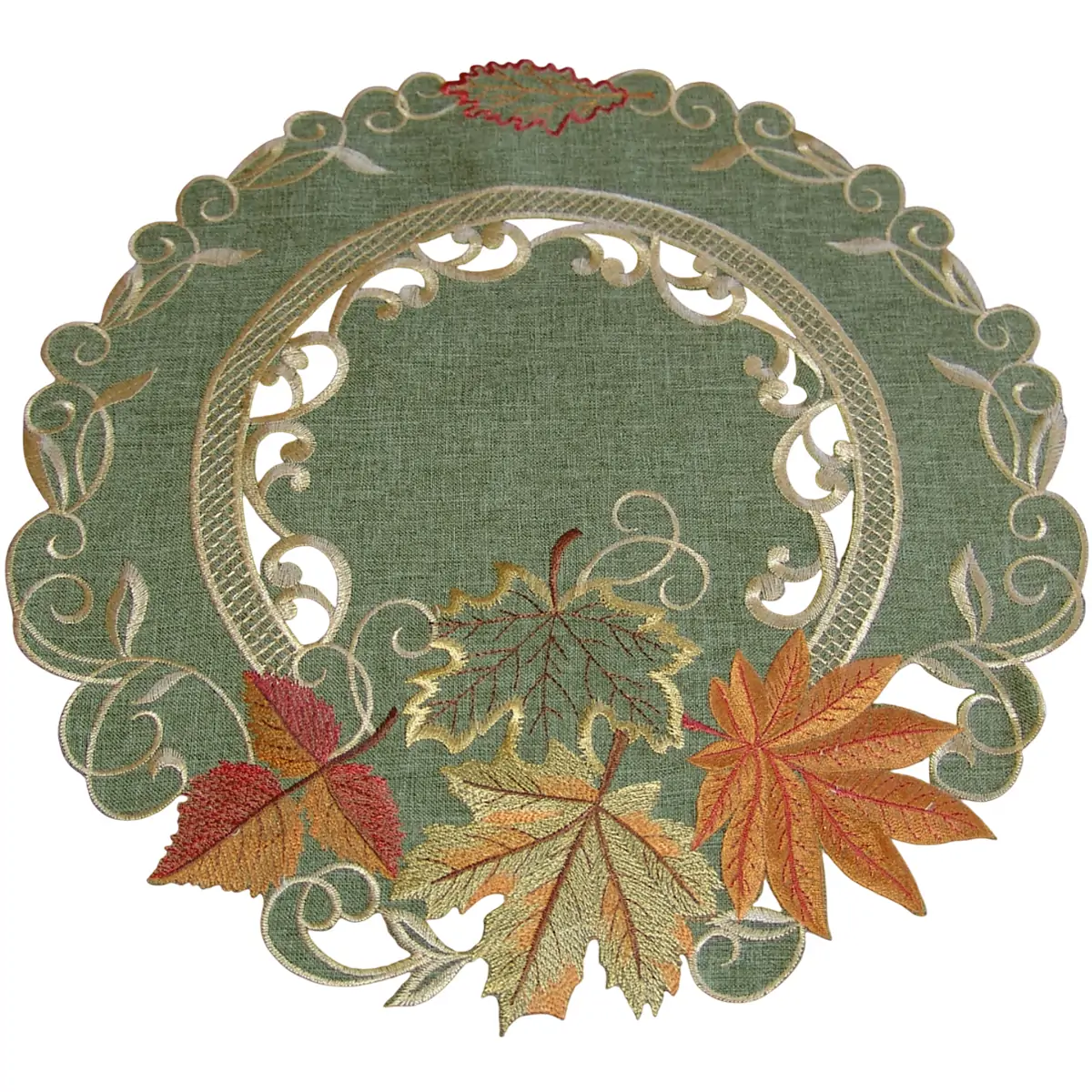 Das runde Tischdeckchen CLAIRE Ø 40 cm bringt herbstlichen Charme in dein Zuhause. Der aufwendige Stick mit bunten Blättern & feinen Cutwork-Details macht dieses Deckchen zu einem stilvollen Hingucker für jede Tischdeko. Die warmen Farben und filigranen Verzierungen verleihen deinem Wohnraum eine gemütliche, einladende Atmosphäre – ideal für den Herbst. Gefertigt aus 100 % Polyester, überzeugt dieses Deckchen durch Langlebigkeit, Formbeständigkeit & Pflegeleichtigkeit. Das hochwertige Material ist knitterarm, farbbeständig & maschinenwaschbar bei 30 °C. So bleibt die herbstliche Stickerei auch nach vielen Wäschen schön. Zudem trocknet das Material schnell & muss kaum gebügelt werden, was die Nutzung besonders praktisch macht. Ob auf dem Esstisch, Beistelltisch oder als dekorative Unterlage für Kerzen & Herbstdeko – CLAIRE ist vielseitig einsetzbar & passt perfekt zu rustikalen, klassischen oder modernen Wohnstilen. Auch als Geschenkidee für Herbstliebhaber oder als stilvolle Ergänzung zur Landhausdeko eignet sich dieses Deckchen hervorragend. Ergänze deine Herbstdeko mit diesem charmanten, detailreich bestickten Tischdeckchen & schaffe eine warme Wohlfühlatmosphäre.