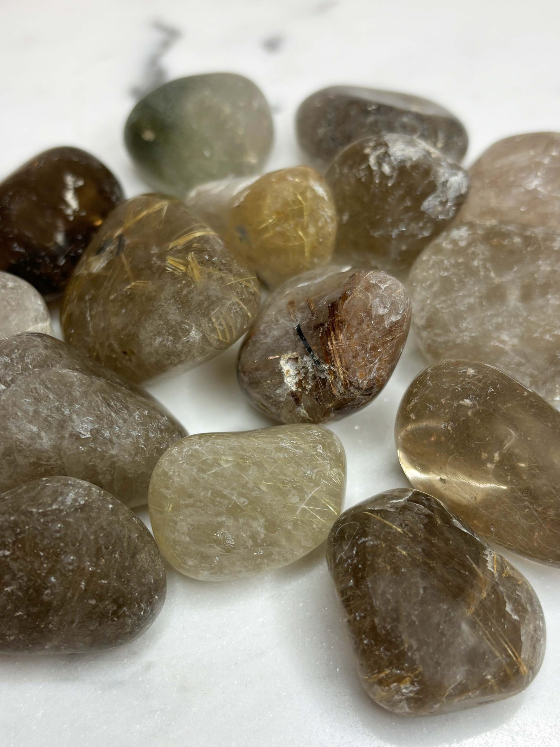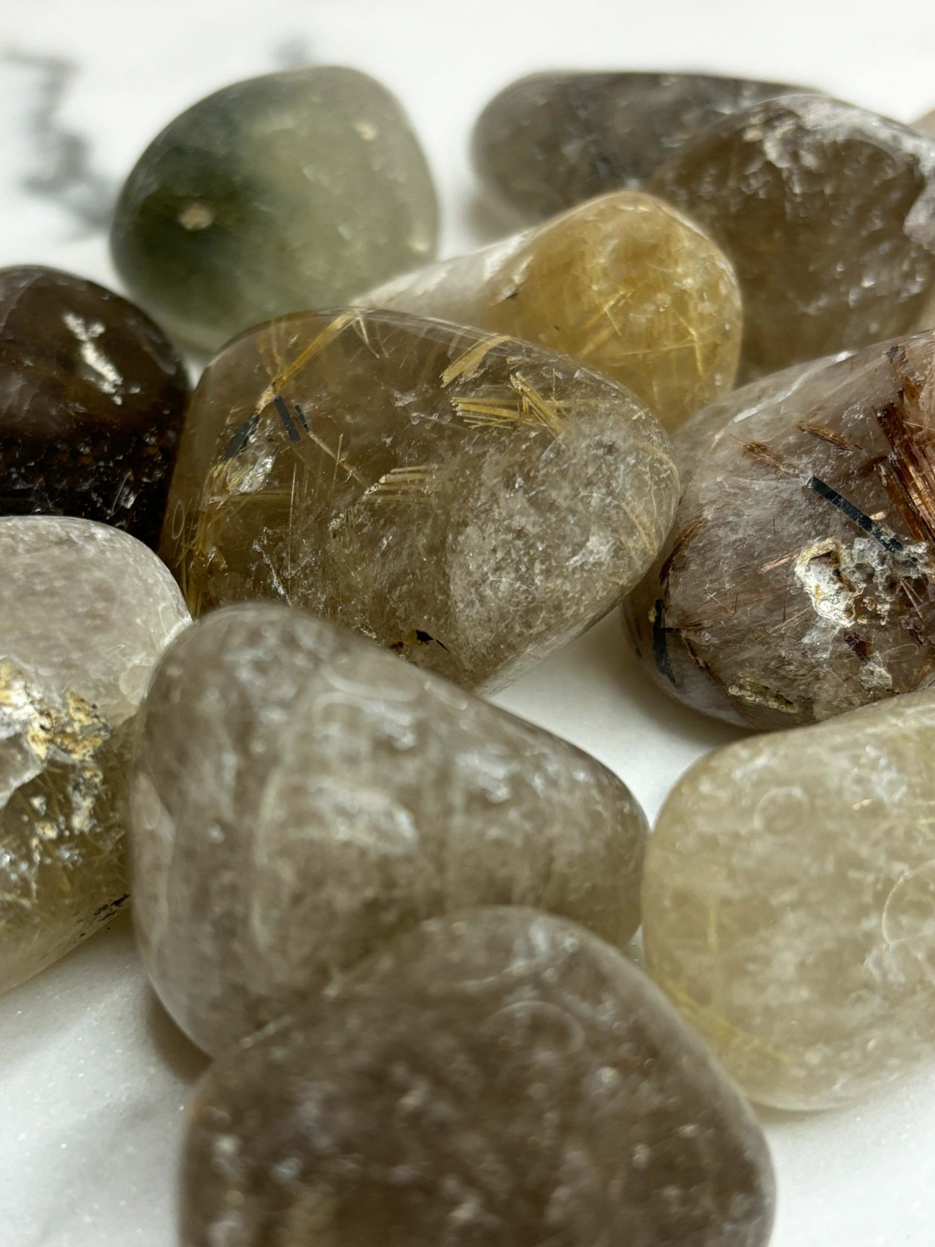 Wunderschöne und glatt polierte transparente Trommelsteine aus edlem Rutilquarz.