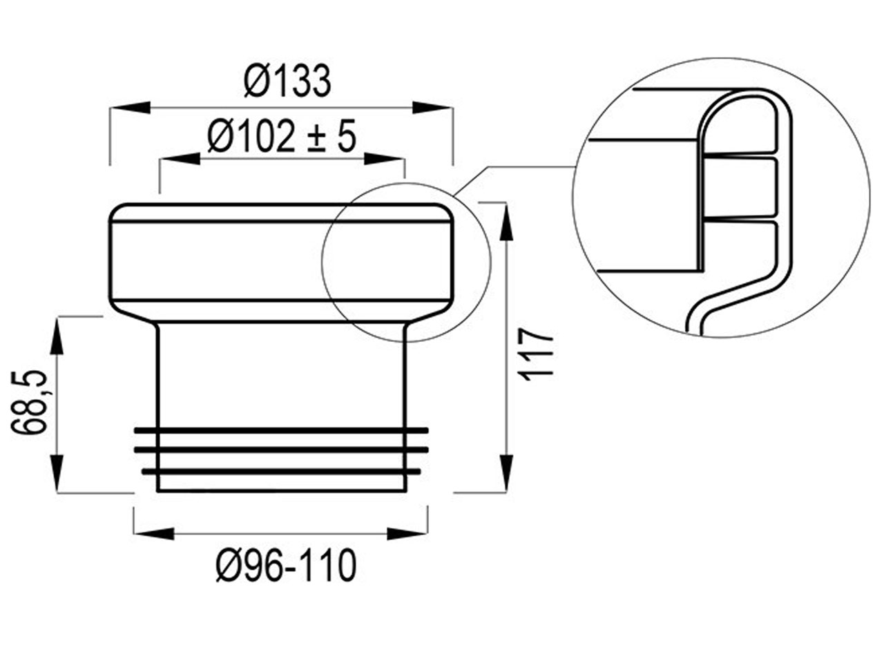- Baumaße: Innen Ø 96mm bis Ø 110mm, Aussen Ø 133mm, Baulänge 117mm