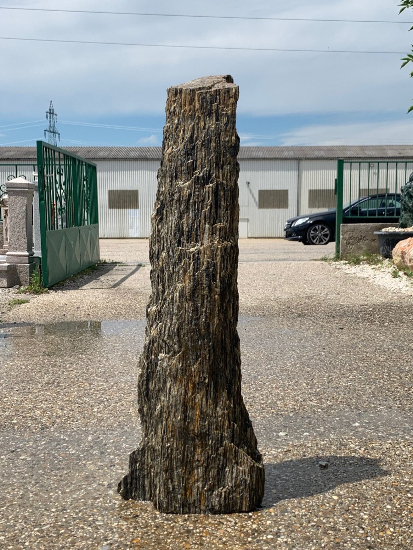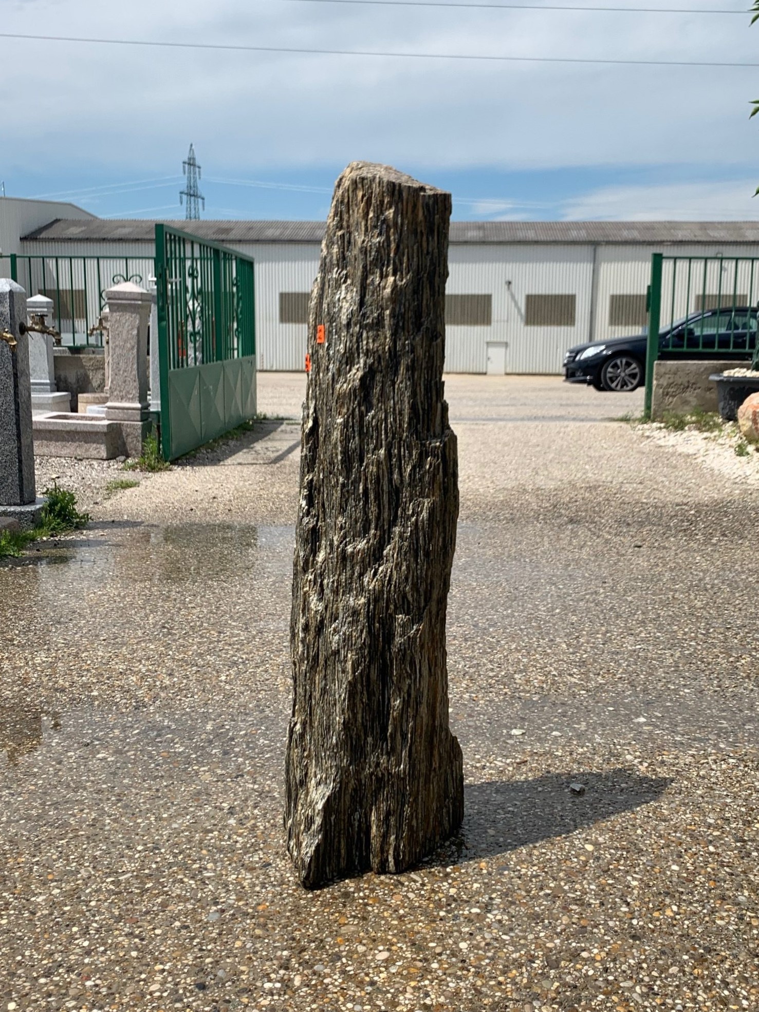 Schwarz, weiß, braunes Hartgestein, Die stabförmige Oberflächenstruktur erinnert an versteinertes Holz. Das Material ist 100% frostsicher!