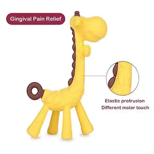 100% Silikon in Lebensmittelqualität, CPC-zertifiziert, BPA-frei. Stehende Basis für einfache aufrechte Aufbewahrung, um Ersticken und Halten zu verhindern. Der Giraffenbeissring mit mehreren strukturierten Rillen für unterschiedliche Anlaufzeiten.