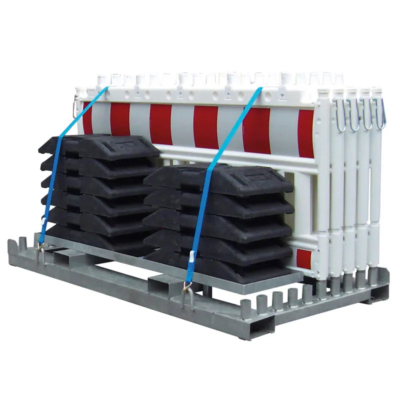 Die aufnehmbare Menge an Absperrschrankengittern reduziert sich durch das Aufsatzteil ca. um die Hälfte, aber dafür haben Sie alles beisammen um Absperrungen aufzustellen.