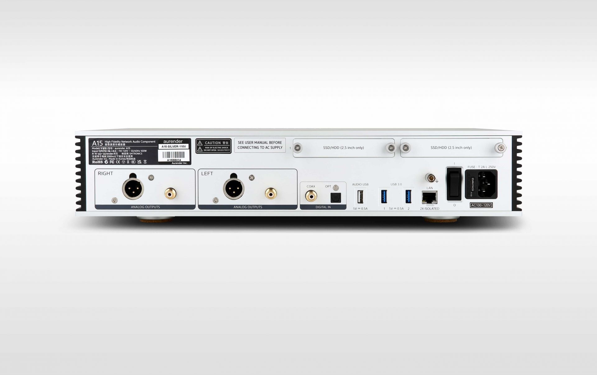 Aurenders einzigartiges „Adaptive File Library Storage System“ unterstützt beim A15 zwei Laufwerksschächte auf der Rückseite zur HDD/SSD-Installation durch den User. Dieser kann die seinen Anforderungen am besten entsprechende Hardware selbst wählen. Aktuell sind dabei bis zu 16 TB SSD-Speicher möglich.