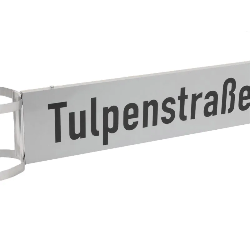 Mit unserer Bandschelle für Straßennamenschilder aus Aluminium befestigen Sie Straßenbenennungsschilder mit Spannbändern an Pfosten und Masten.