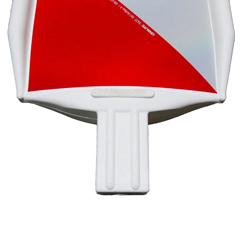 Sie ist leicht, robust, einfach im Handling und passt in fast alle gängigen Fußplatten. Die rot-weißen Diagonalstreifen sind beidseitig in RA1-Folienqualität angebracht. Damit entspricht die Bake nicht den RSA 21-Anforderungen für den öffentlichen Straßenverkehr.
