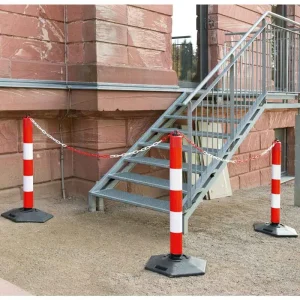 Mit der flachen Montageplatte für Steh-Auf-Leitpfosten und Flexpoller werden kippbare und selbstaufrichtende Pfosten sicher auf dem Boden angeschraubt.