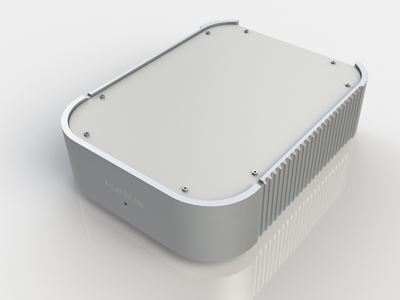 Der Plinius P100 Phono-Vorverstärker zeichnet sich durch die klaren Linien und den Minimalismus aus, die für die Plinius-Ästhetik stehen. Das schlanke, geschwungene Gehäuse bleibt mit Ausnahme einer blauen LED-Anzeige und des Plinius-Brandings frei.