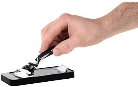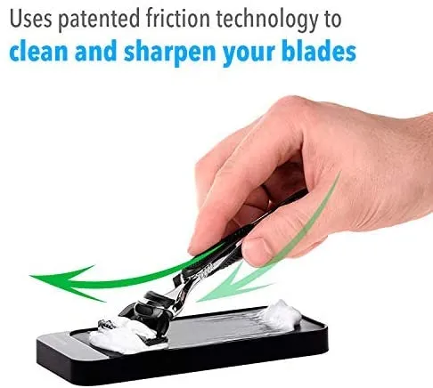 - Einen Halter für den Rasierer, der zu einem schnelleren Trocknen der Rasierklinge nach Gebrauch beiträgt.