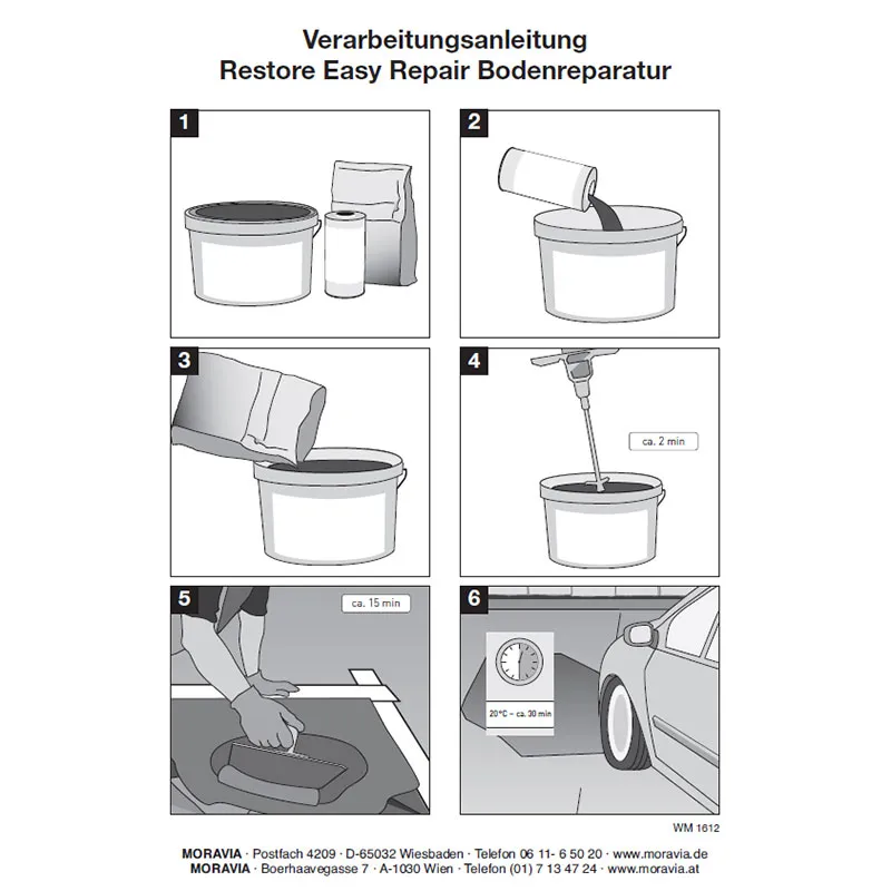 Das Moravia Reparaturset ist für die gängigsten Böden, wie Beton, Asphalt oder Estrich geeignet. Nach etwa 20 Minuten ist es bereits so weit ausgehärtet, dass die Straße wieder befahren werden kann. Die Farbe des Restore Easy Repair Bodenreparatursets entspricht etwa RAL7021 (Schwarzgrau).