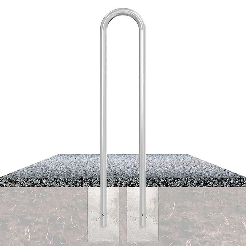 Die zweibeinigen Absperrbügel mit 300 mm Breite werden im Boden einbetoniert. Als Auszugssicherung aus dem Betonfundament liefern wir Ihnen 2 Erdanker aus Rundstahl mit. Die Löcher im Rundrohr unten sind entsprechend vorgebohrt.