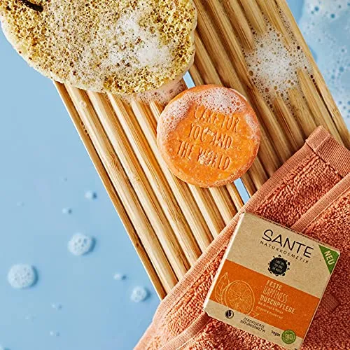 - Die SANTE HAPPINESS Feste Duschpflege ist die nachhaltige Alternative zu herkömmlichen Pflegeprodukten. Verpackt in einem Karton aus wiederverwerteten Fasern – #noplastic – hat sie einen fruchtigen Duft und ist sanft schäumend, sodass Sie keine Kompromisse eingehen. Die Haut wird mit milden Tensiden ohne Austrocknen gründlich gereinigt und angenehm erfrischt. Die enthaltene Bio-Orange hat außerdem belebende und regenerierende Eigenschaften. Es entsteht ein zartes Hautgefühl in Kombination mit einem unnachahmlichen Anti-Spannungsgefühl.