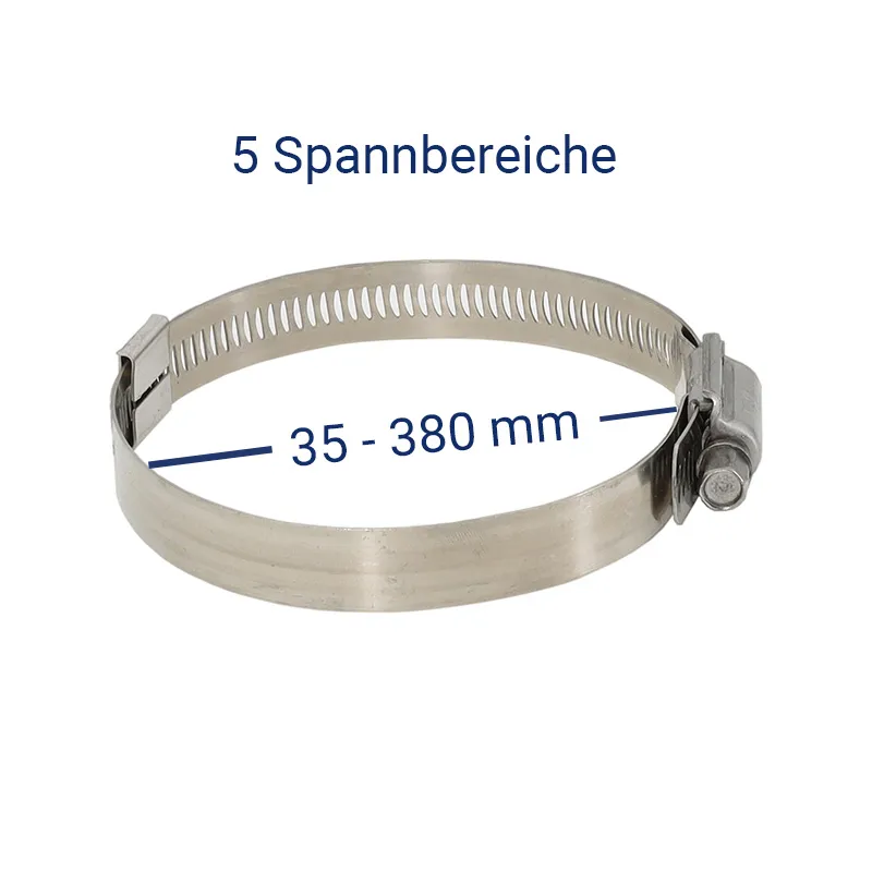 Die hochwertige Edelstahlspannvorrichtung mit starker Belastbarkeit beim Andrehen ist in 5 Größen von Ø 35 bis 380 mm bestellbar und zur direkten Montage vorbereitet.