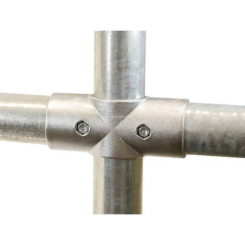 Das Kreuzstück besteht aus zwei Halbschalen, die mit zwei Schrauben und Muttern zusammengefügt werden. So kann das Kreuzelement auch bei einem bereits bestehenden Sperrgeländer montiert werden. Es wird zum Beispiel um das Standrohr befestigt und kann rechts und links noch jeweils ein Querrohr aufnehmen, wodurch es sich für 3 Rohre eignet.