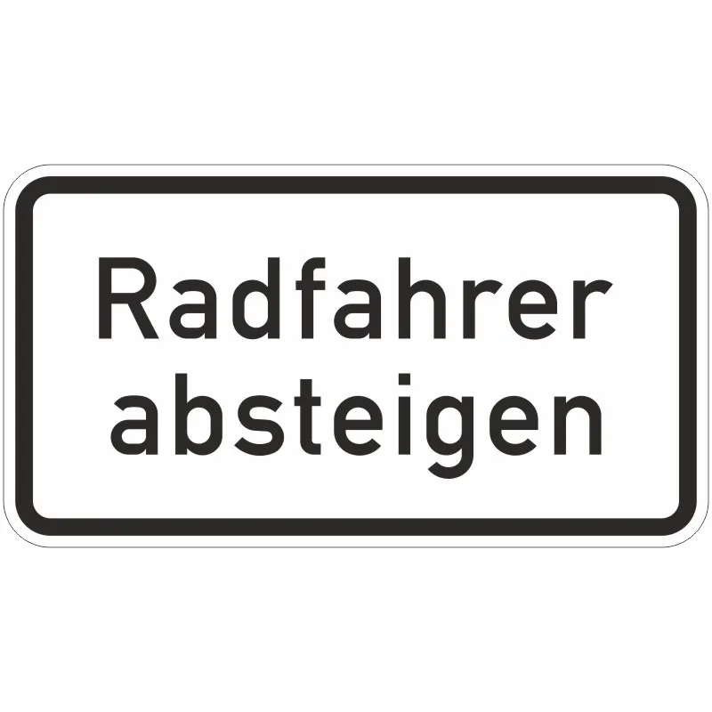 Das Verkehrszeichen 1012-32 „Radfahrer absteigen“ ist ein Zusatzschild in Rechteckform mit weißem Grund, schwarzem Rand und der schwarzen Angabe „Radfahrer absteigen“.