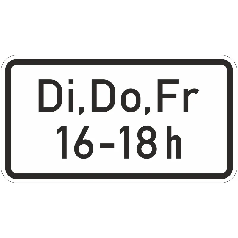 Unser Verkehrszeichen 1042-34 Zeitliche Beschränkung (Wochentage oder Tag, mit einer Zeitangabe) erhalten Sie in den folgenden Bauarten: