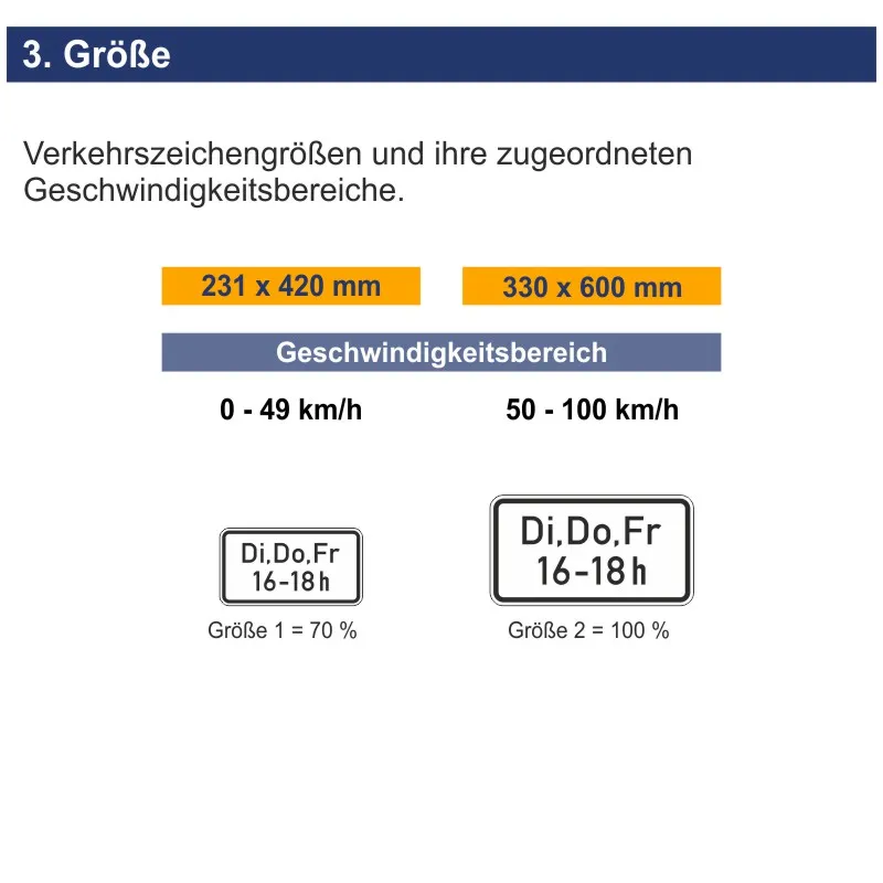Bei den verschiedenen Verkehrszeichenarten, wie z.B. Gefahrenzeichen, Vorschriftenzeichen, Richtzeichen oder Zusatzzeichen, können Sie zwischen unterschiedlichen Größen wählen die sich an die vor Ort gefahrenen Geschwindigkeiten anpassen sollten. Ein kleines Beispiel um dies zu verdeutlichen: