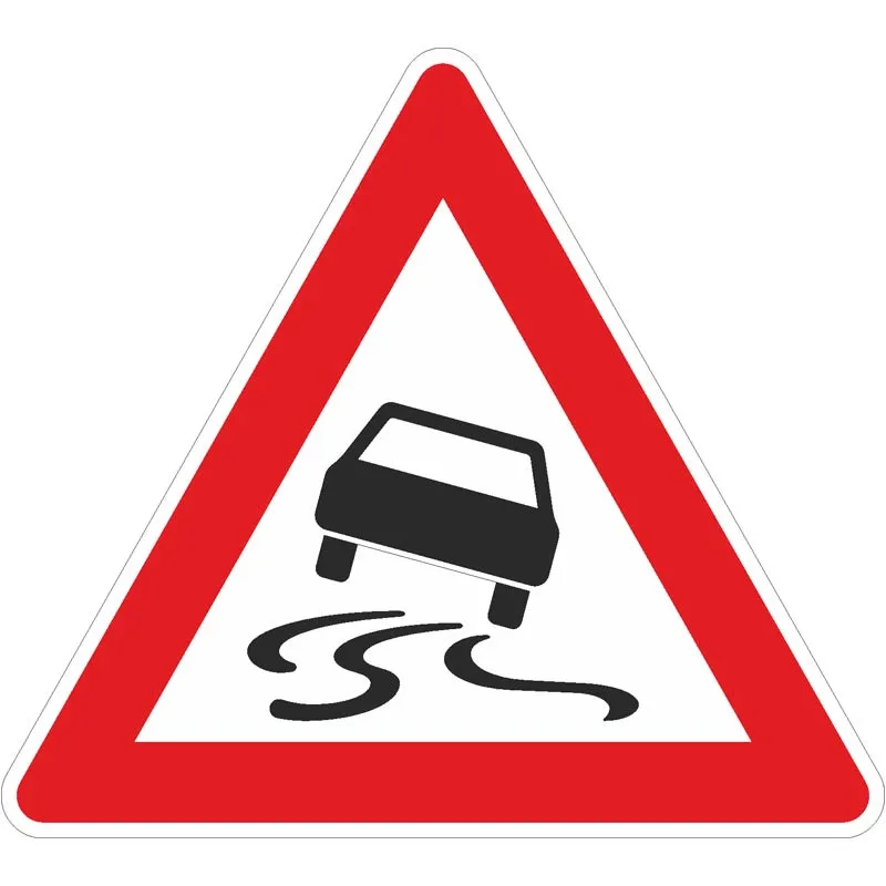 Das Gefahrenzeichen 114 „Schleuder- oder Rutschgefahr“ warnt vor gefährlichen Situationen, die bei der Einfahrt in nasse oder verschmutzte Fahrbahnabschnitte entstehen können. Aufgrund verminderter Griffigkeit des Fahrbahnbelags besteht die Gefahr, dass Fahrzeuge rutschen oder schleudern können.