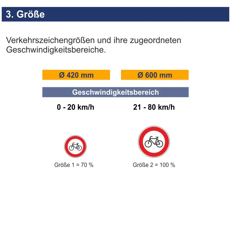 Besonderheit: Wenn einzelne Verkehrsarten ausgeschlossen werden, sind die vorherige Ankündigung sowie Hinweise auf eine Umleitung erforderlich. Informationen über die Gründe von Verkehrsverboten, hier beispielsweise in Verbindung mit Fußgängerbereichen, enthält die Straßenverkehrsordnung § 45 Abs. 1 bis 1b.