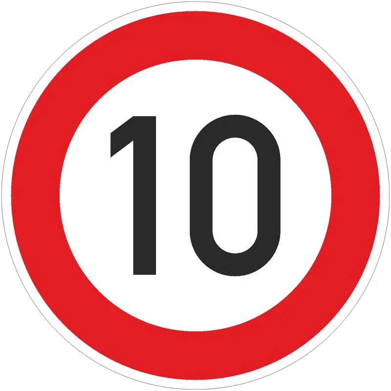 Das Verkehrszeichen 274-10 „Zulässige Höchstgeschwindigkeit 10 km/h“ ist ein rundes Verkehrsschild (Ronde) mit rotem Rand, weißem Grund und einer schwarzen Zehn in der Mitte. Die Ziffer steht für die maximal erlaubte Geschwindigkeit.