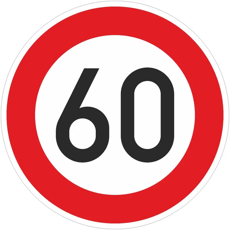 Bedeutung: Mit dem Gebots- bzw. Verbotszeichen 274-60 wird dem Fahrverkehr signalisiert, dass eine Geschwindigkeit von 60 km/h nicht überschritten werden darf.