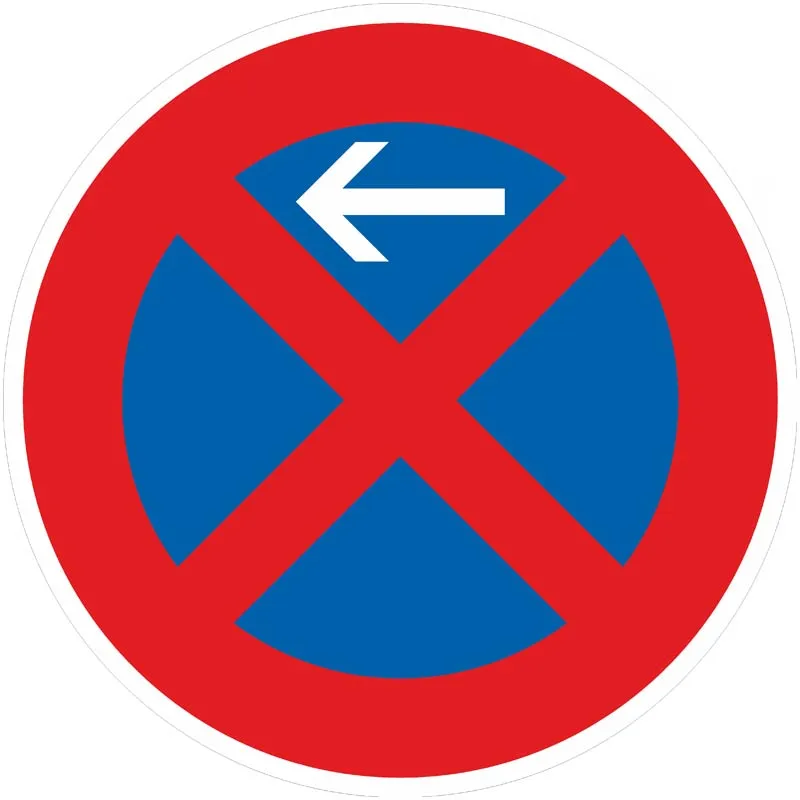 Das Verkehrszeichen 283-10 „Absolutes Halteverbot Anfang, Aufstellung rechts“ ist ein rundes Schild mit rotem Rand und x-förmigem Kreuz in Rot auf Blau. Im oberen blauen Viertel ist ein weißer Pfeil angebracht, der nach links zur Fahrbahn zeigt.